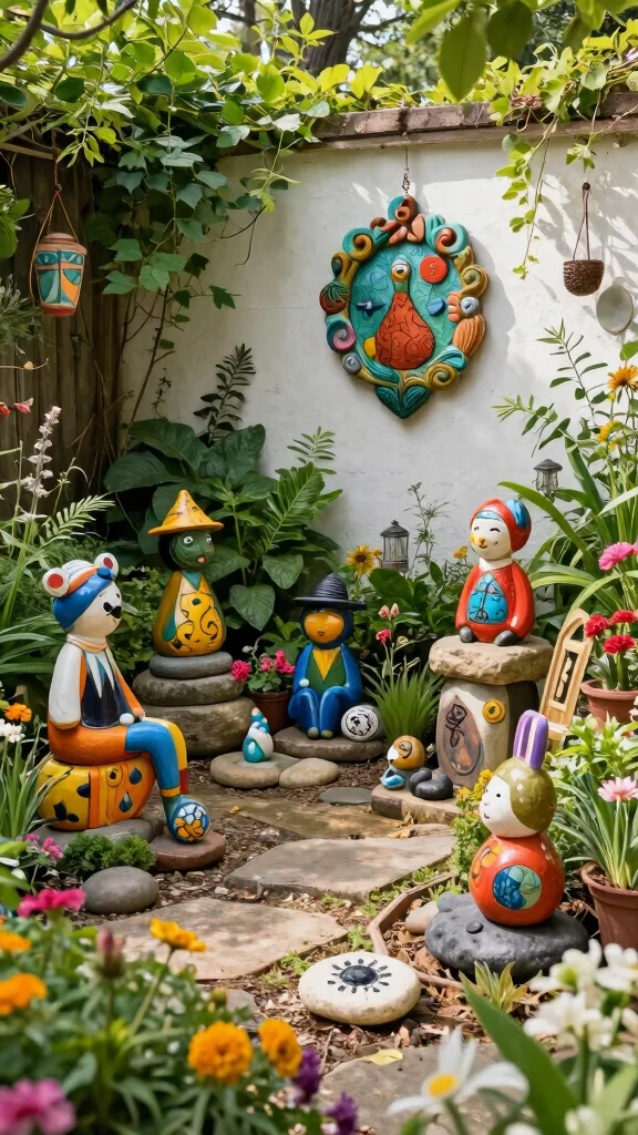 Outdoor art adds a personal punch to the garden. Sculptures, wall hangings, and stepping stones turn space into a gallery. Pick pieces that reflect your style and hold up to weather. Place art where it can be seen from seating areas. Pair art with plants to create focal points.
