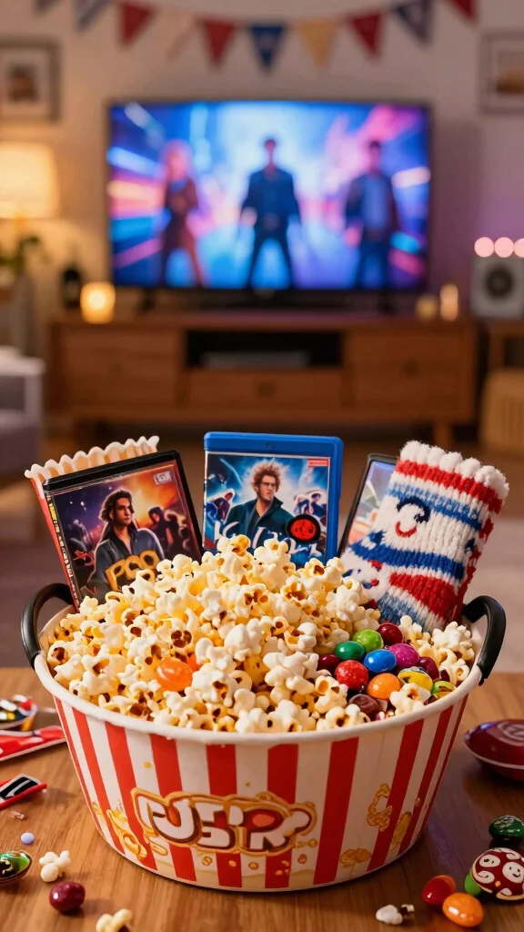 This basket brings cinema vibes home. Fill with popcorn, candy, and soda. Add a couple of popular DVDs or a streaming service gift. Don’t forget cozy socks or a themed blanket to keep the mood warm. It fits family nights or a cozy night in with friends.