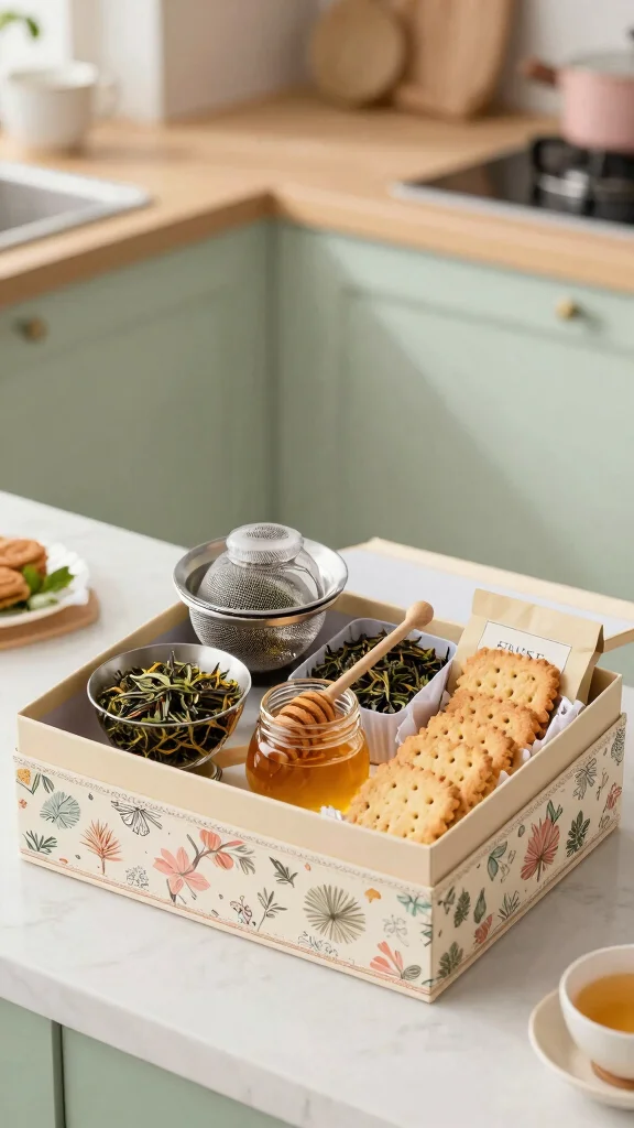 End the list with a comfort food basket. Fill it with favorite snacks, a homemade recipe for a family dish, and cozy items like a warm blanket or a mug. Soft, warm colors add to the cozy feel. A handwritten recipe card adds a personal touch. This box taps into home and daily comfort. It makes the gift feel familiar and warm.