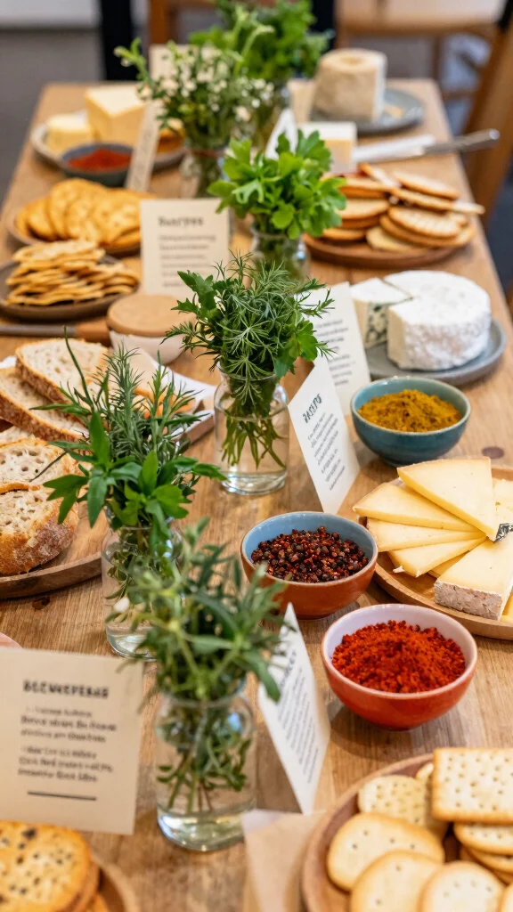 Herbs and spices offer aroma and flavor. A simple, fresh display can educate as well as tempt. Place herbs in small vases so guests can sniff their best scents. Offer tiny bowls of spices and salts to season foods themselves. Pair soft cheese and crackers with herbs to invite experimentation. A quick recipe card beside the board helps guests learn about each herb.