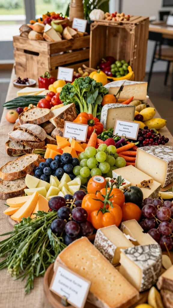 Local foods create real flavor. Show where items come from with tiny signs and notes. A mix of cheeses, meats, breads, and seasonal produce highlights local makers. Colorful vegetables and fruit bring life to the table. The story of place makes the meal feel special. Keep items fresh and rotate to show peak produce. A small map of local sources connects guests to the land.