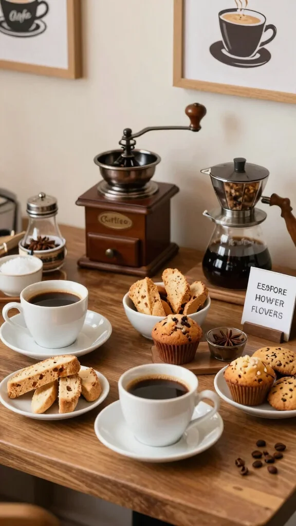Include non-dairy options and flavored creamers. Use coffee beans as tabletop decor—scatter them lightly—or in small bowls as a rustic accent, and cinnamon sticks as aromatic touches.