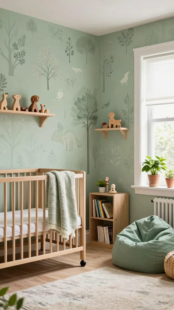 Choose clean-lined furniture in light wood tones and complement with breathable textiles in off-white, beige, or stone. Add subtle greenery and nature-inspired art to anchor the theme without overpowering it, keeping your sage green nursery ideas focused on balance and serenity.