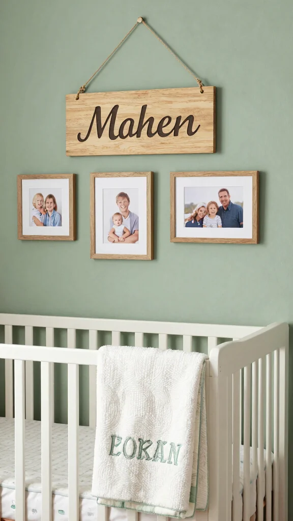Add a custom name sign near the crib or on a focal wall. Personalize blankets or wall hangings with initials or quotes. Create a small photo gallery of loved ones to feel close to your family.