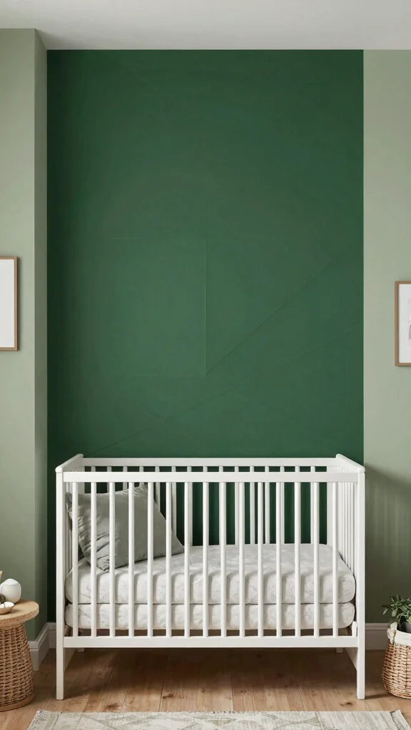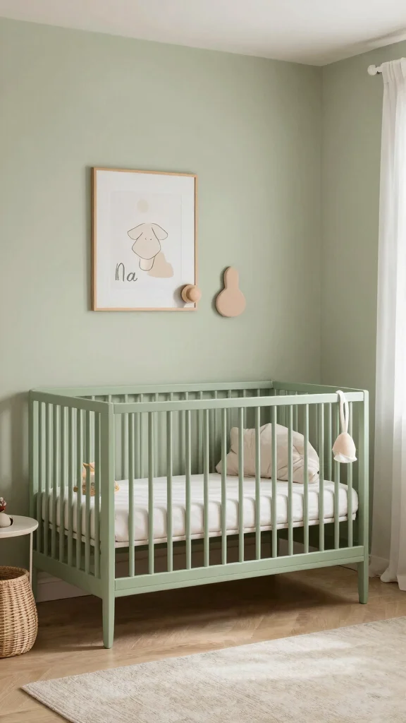 Use sage green as an accent rather than a full-wall color—think sage bedding, a throw, or a rug, paired with a white or warm-neutral wall. Keep large furniture in whitewashed or pale wood and let natural textures shine. Add accessories like linen curtains, woven baskets, and botanical prints to reinforce sage green nursery ideas while preserving a calm, minimal vibe.