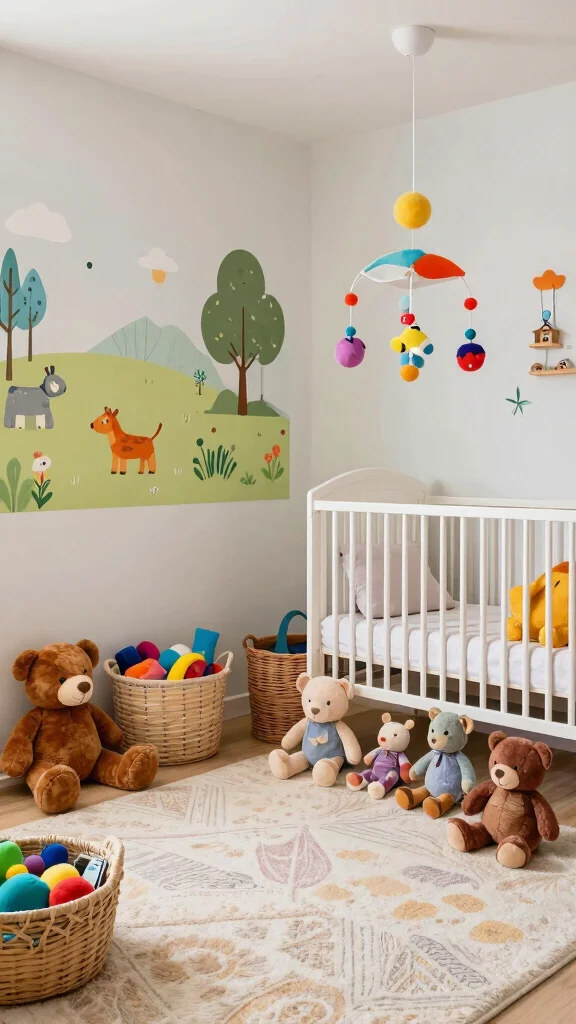 Choose plush toys for color and texture. Decorative baskets offer style and storage. Hang playful art to spark joy and conversation.
