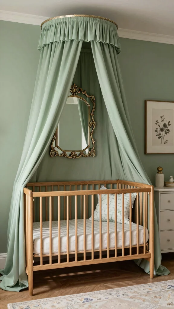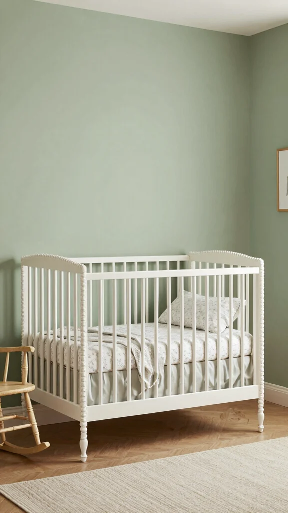 A vintage-inspired crib becomes a striking focal point in a sage green space. It blends nostalgia with clean safety.
