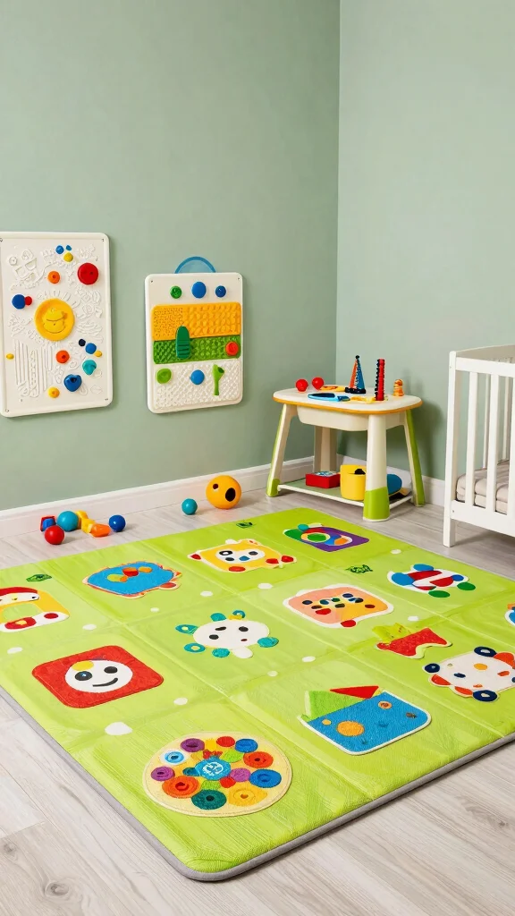 Add a bright play mat for contrast, a small toy corner, and crafts station. Wall activities like a chalkboard or sensory board stimulate the mind.