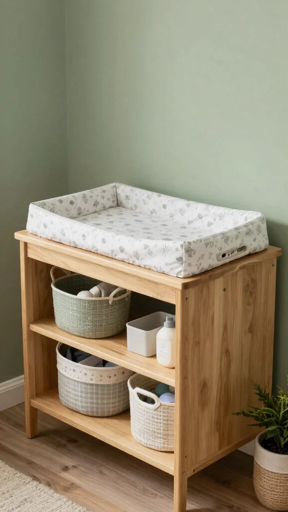 Pick a changer in natural wood or a sage finish. Add baskets for wipes and diapers to keep things tidy. Use a soft patterned pad to tie the look together.