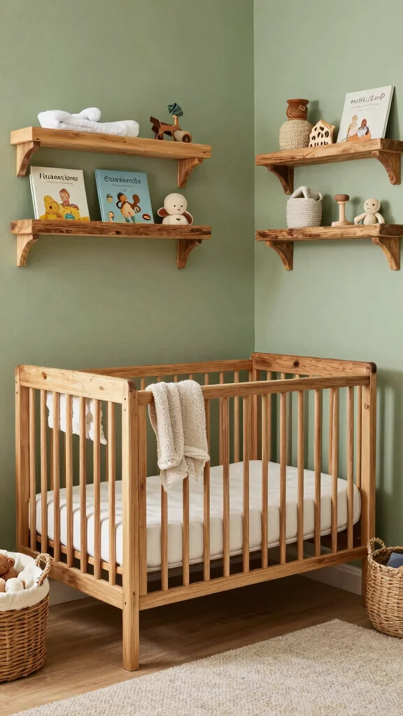 Embrace rustic touches like reclaimed wood shelves, a simple slatted crib, and wicker storage that echo nature without shouting color. Pair with a textured linen or burlap rug and matte black or brushed bronze hardware for subtle contrast. Use dried botanicals and pinecones sparingly to keep it minimal. These neutral and nature-inspired elements harmonize with sage green nursery ideas and keep the space calm and cohesive.