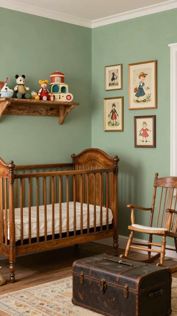 Look for a vintage crib, dresser, or chair that you can refresh in pale greens or white. Old decor pieces on shelves become talking points as your child grows.