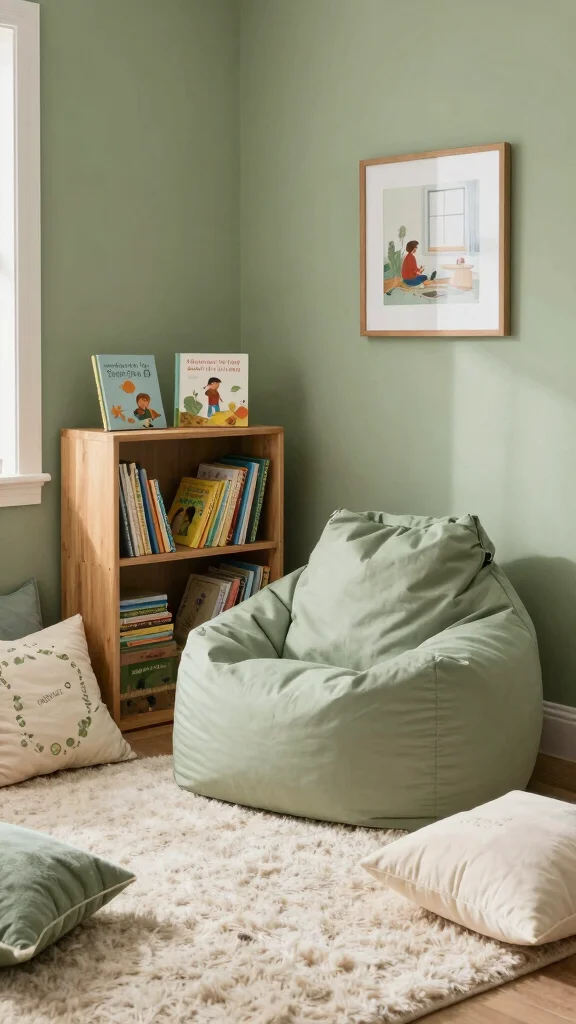 Pick a comfy chair in a soft green or cream. A small bookshelf with colorful kids’ books and plush toys completes the setup. Layer cushions and a tiny rug to create a cozy retreat.