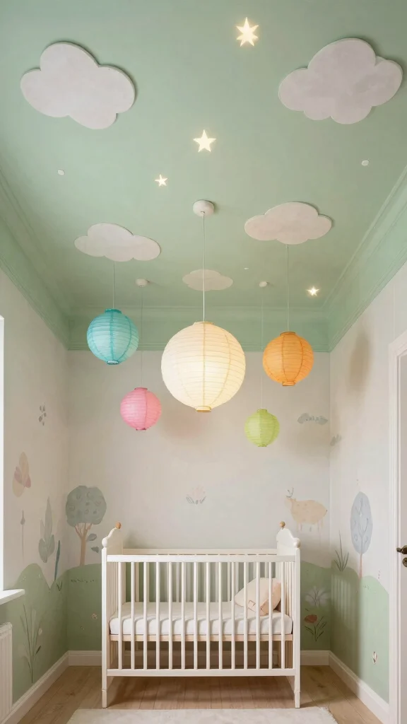 Consider hanging mobiles or paper lanterns to add motion and color. A fabric canopy or tent-like drapes can create a dreamy loft feel.