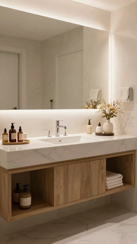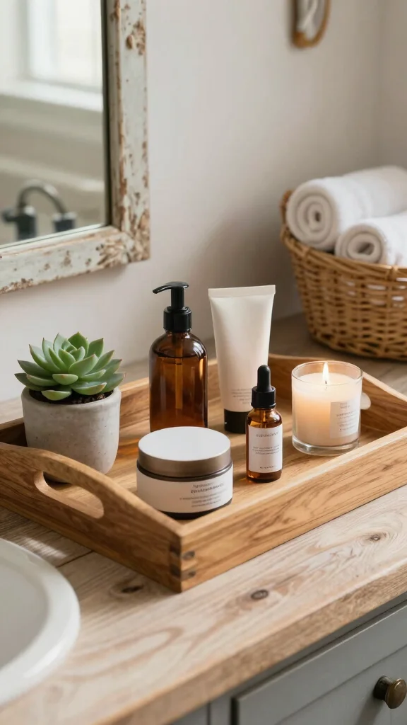 For a rustic decor twist, try a weathered wood tray and matte ceramic accessories. A slim under-counter or over-counter display shelf can showcase fragrance bottles while keeping the main counter clear. Remember: limit to 3-5 well-chosen pieces so your space feels luxe rather than cluttered.