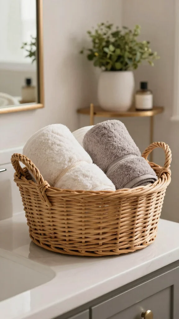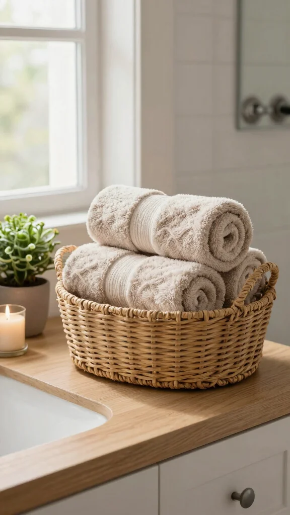 Showcase towels as part of the decor, not just storage. Roll them neatly and stack in a basket or tiered tray. Soft colors like ivory or pale blush read as luxury against clean surfaces. A folded pair beside a plant or candle adds spa vibes, making the counter feel inviting and indulgent.