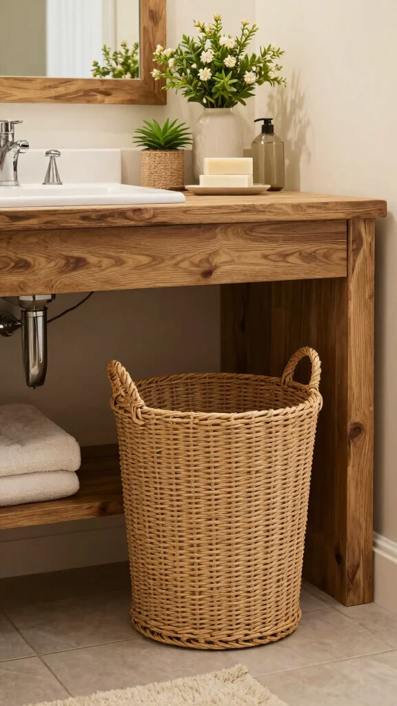 A well chosen waste basket can lift the whole space. Pick wicker or woven styles that fit your rustic theme. Keep colors in line with the rest of your palette so even a practical item looks intentional. Place the basket where it’s easy to reach but tucked away from the main display. A neat bin supports a tidy, attractive counter.