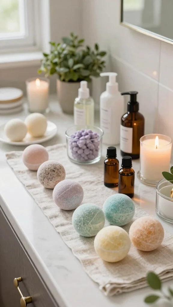 Bring a spa mood to your counter with calm, curated items. Glass jars of bath bombs, oils, and cotton balls make a chic display. A small shell dish for salts or exfoliants adds a touch of seaside calm. Clear containers let colors shine, while staying organized. Soft lighting completes the tranquil retreat you deserve after a long day.