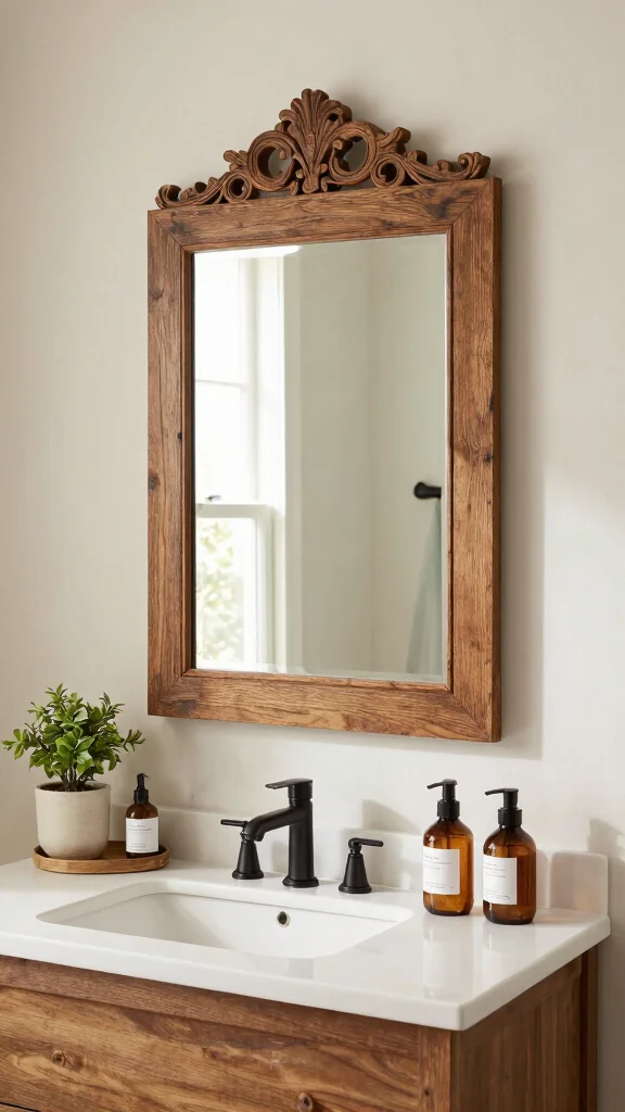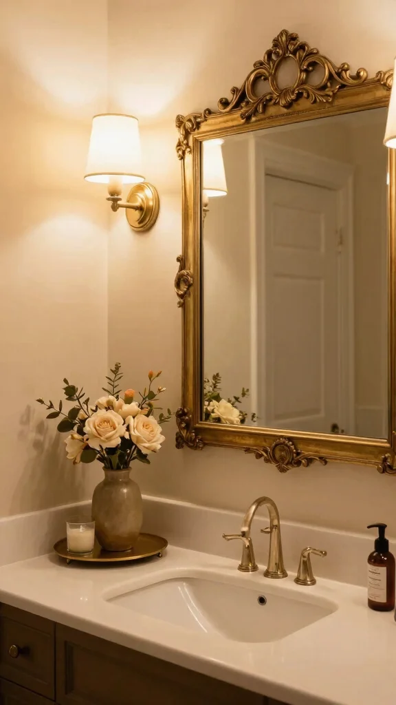 A decorative mirror doubles as art and light source. A rustic frame suits farmhouse charm, while an ornate oval fits vintage style. Place it where it reflects towels, jars, or greenery to multiply brightness. Round shapes or antique silhouettes add character, and subtle accent lighting around the edge brings extra glow. Reflections make textures sparkle and give the counter more depth.