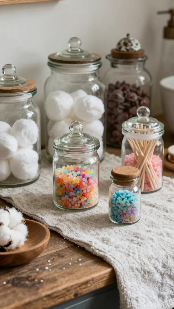 Vintage apothecary jars bring nostalgia and elegance to your counter. Clear glass or ceramic jars with ornate lids showcase cotton balls, swabs, or bath salts beautifully. They keep essentials tidy while turning a simple bath area into a curated display. Vary heights and shapes for a dynamic visual rhythm, and add charming tags for a personal touch if you like.
