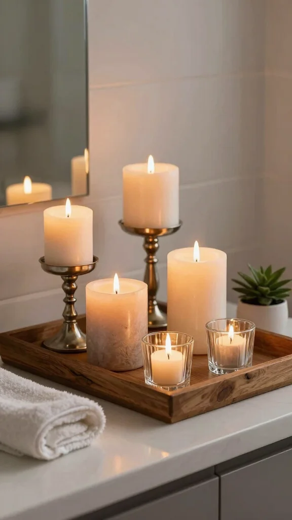 Candles instantly create a sense of luxury and warmth on the counter. Use a mix of heights and styles to form a focal point. Brass holders, glass hurricanes, and white pillars reflect light and add shine. A scented option enhances relaxation, turning a routine into a retreat, while harmonious colors tie the display to the room.