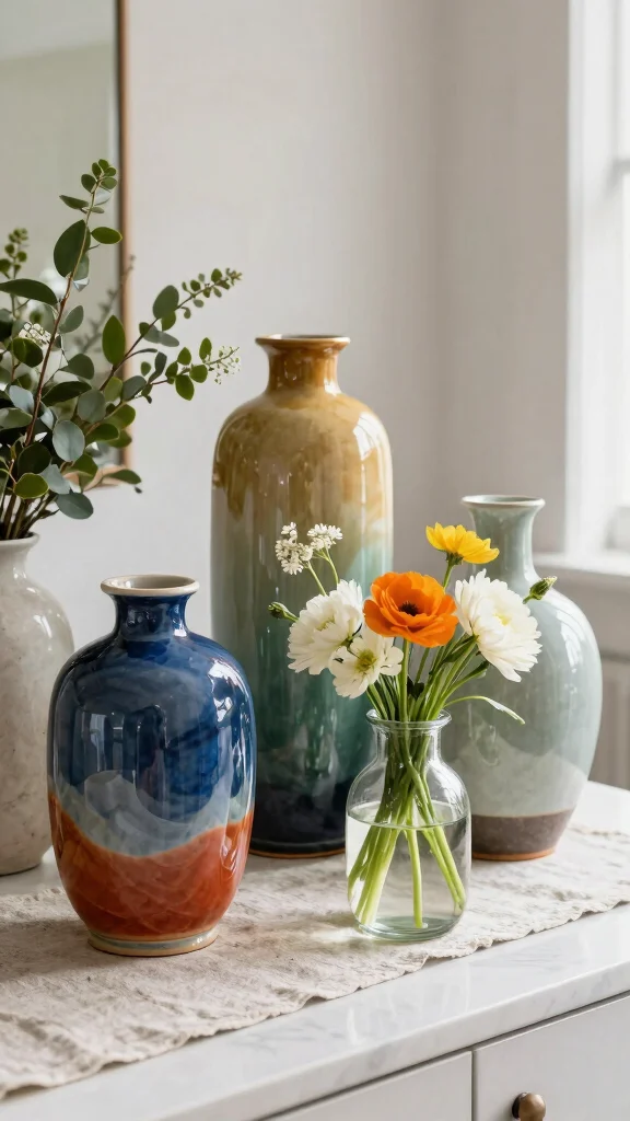 Artistic vases bring sculpture and color to your counter. Pick unusual shapes and finishes like ceramic, glass, or matte metal. Fill with fresh stems or dried arrangements for year‑round beauty. Vary heights to create a gallery feel that draws the eye and sparks conversation. Keep tones in harmony with the room to avoid clashing colors.