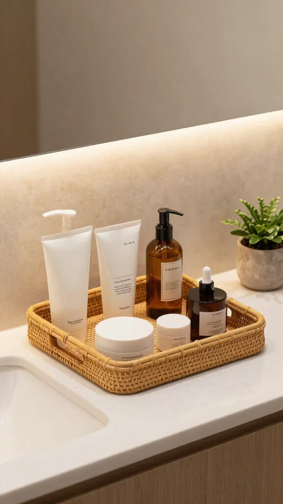 Keep trays clean to preserve their charm. Use smaller trays for daily essentials and use larger ones for perfumes and soaps. Mix textures with a linen napkin or a seashell to add depth. A candle adds soft glow, making the counter feel spa-like, and keeps the space inviting for daily routines.