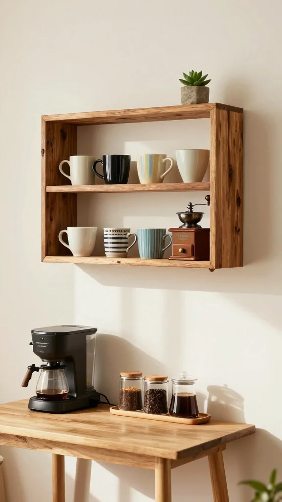 Dream of a simple, airy coffee nook that still works hard for you? Floating shelves do that work with ease. They free counter space while putting your favorite mugs and tiny plants on display. You get function and style in one move. Choose reclaimed wood for warmth or sleek metal for a crisp, modern look.