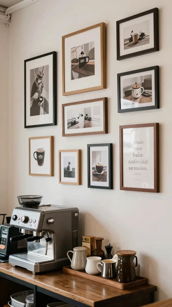 Turn a wall into a small art display. A gallery of photos, coffee quotes, and art tells your story. It adds warmth while making a bold statement.