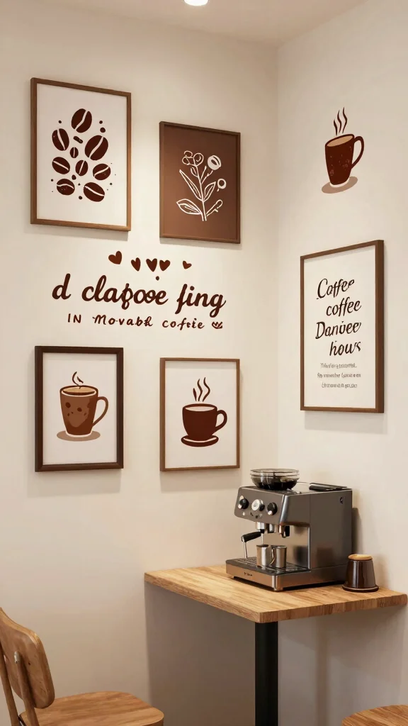 Art tied to coffee warms the space. Prints of beans or mugs pull the theme together. Mix framed art with decals for depth.