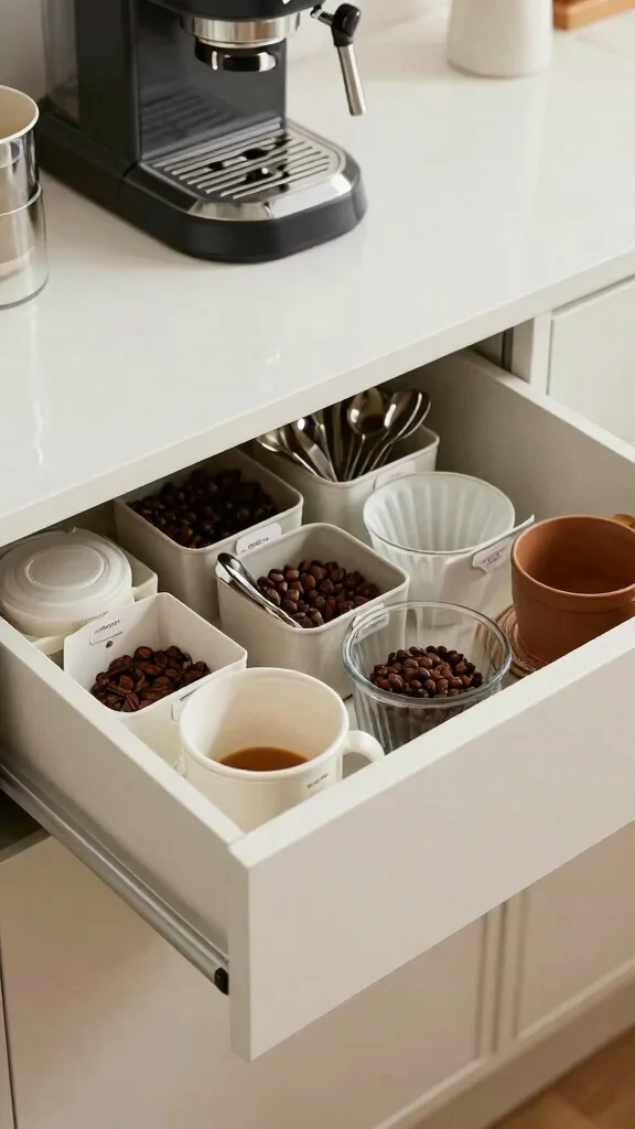 If you lack surface room, turn a drawer into a hidden storage spot for coffee gear. This keeps the area clean while still handy.