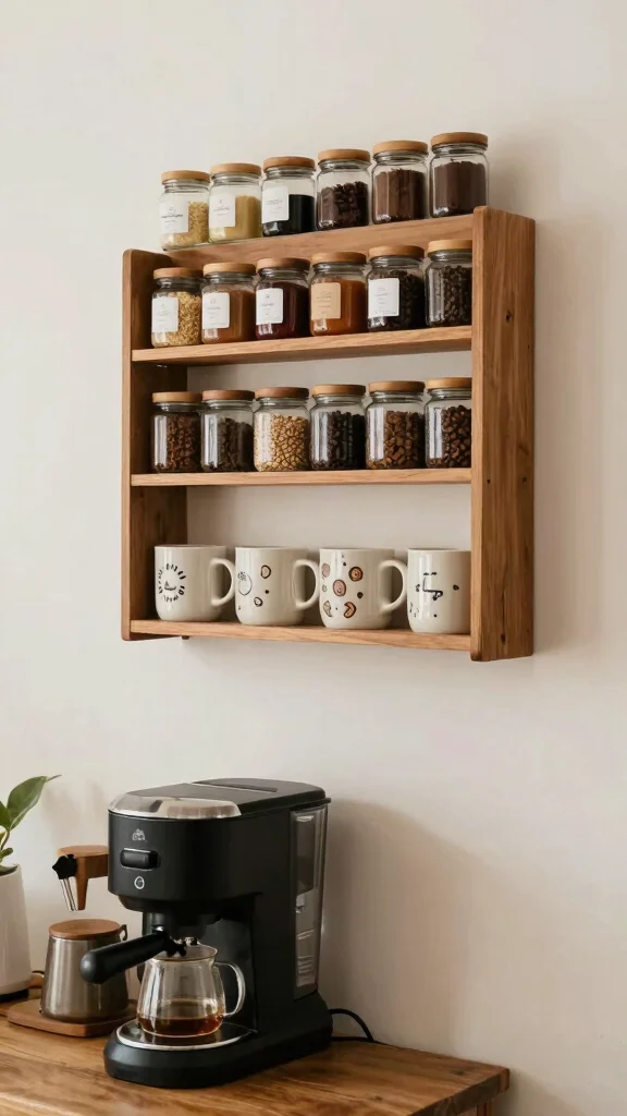 A spice rack can double as a clever organizer for coffee bits or snacks. It uses vertical space well and looks tidy.