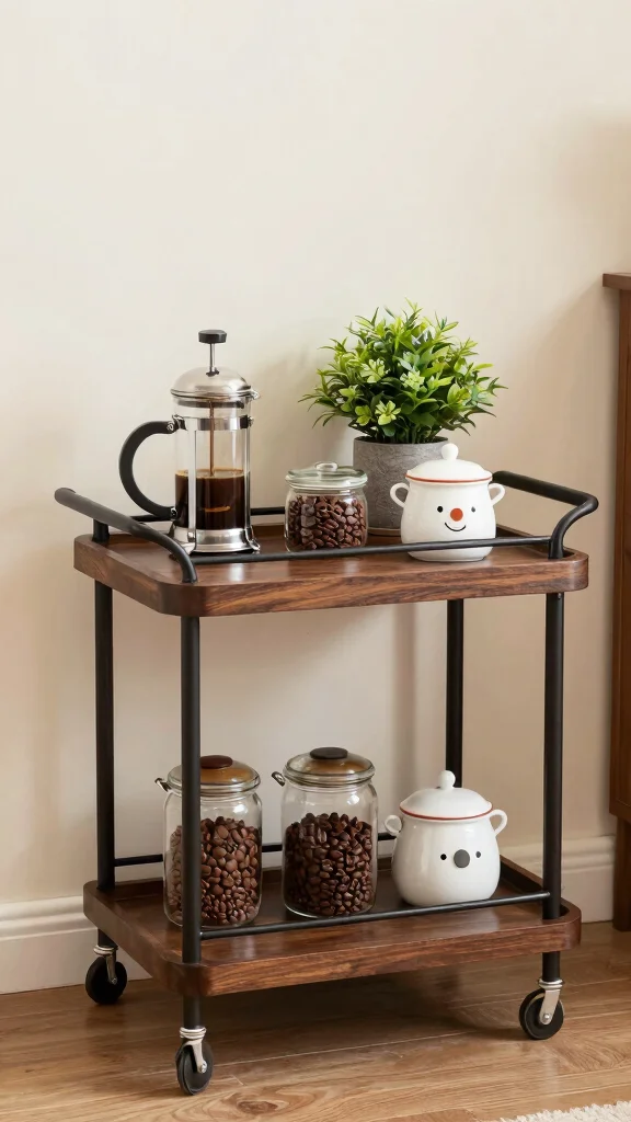 If you want freedom with your coffee gear, a vintage trolley is a smart pick. It rolls where you need it and holds everything in one place. The look adds a friendly, retro charm to your space. Find a trolley with wheels and maybe a bold paint job to brighten the room.