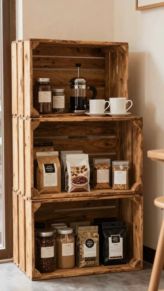 Wooden crates bring charm and practicality. Stack or arrange them to fit your space and store beans, mugs, or snacks.