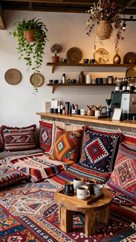Boho style shines with color and texture. Layer textiles and macrame, add unique decor. Stack soft rugs and wooden trays to keep supplies handy. Hanging plants and dried flowers bring life. Mix ceramic mugs with woven baskets for a cozy, lived-in feel. Let items overlap for a warm, inviting space. This setup makes your coffee bar a retreat you’ll love.