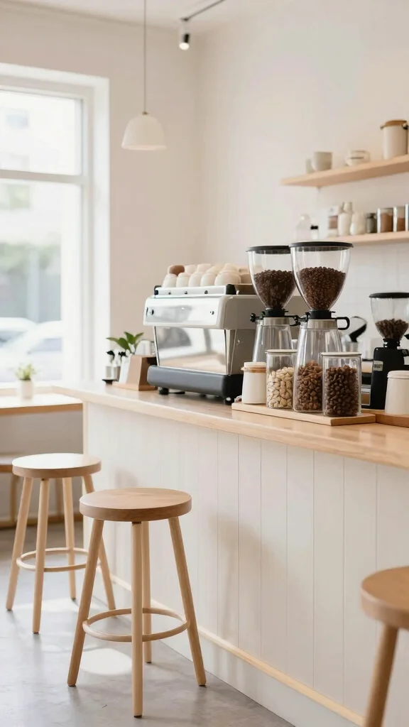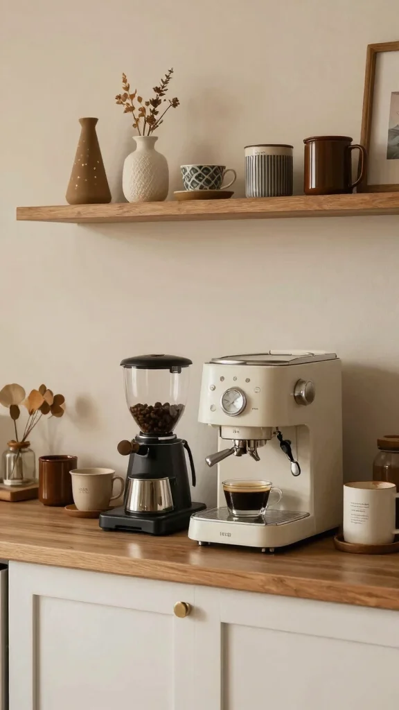 Clean lines define this style. A white or black countertop and geometric shelves keep things neat. Clear glass containers show your coffee beans and sugar, adding calm order. A wall shelf holds the machine essentials, freeing counter space. A single plant or minimal art piece completes the sleek vibe.
