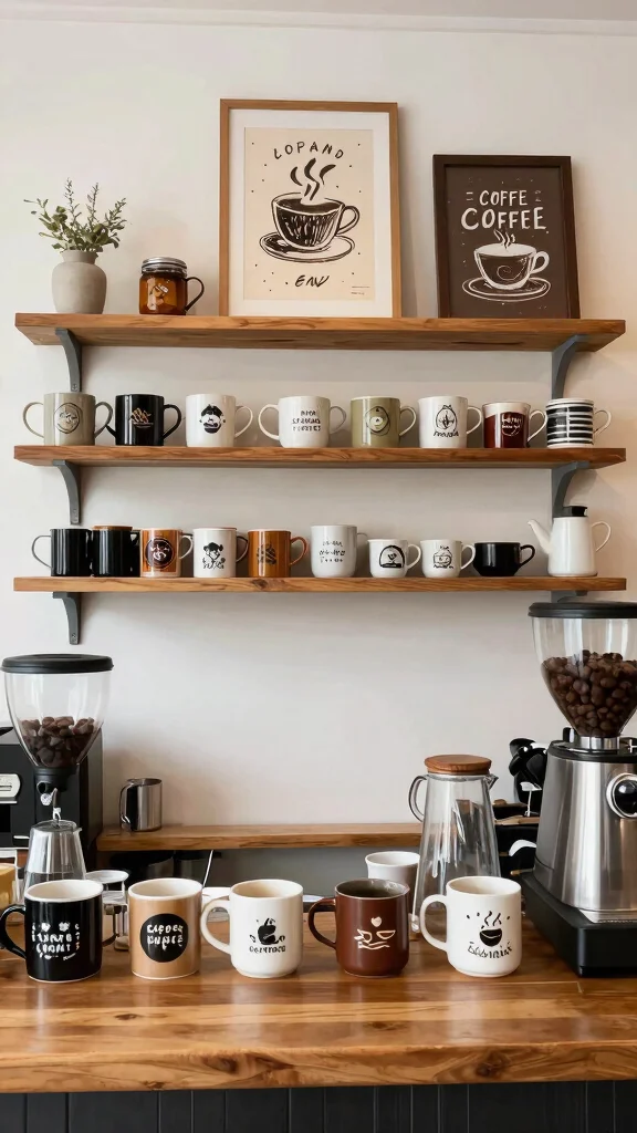 Open shelves showcase your mugs and gear. Use wooden or metal shelves to display favorites. This setup invites touch and adds character. Mix plants or art with your cups to keep it lively.