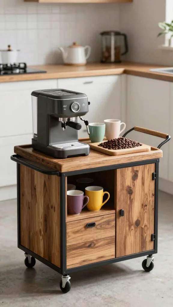 If space is tight, a mobile coffee cart fits perfectly. A rolling cart gives ample storage for your essentials and adds a fun, moving element. Choose a cart that matches your style—rustic wood, sleek metal, or a mix. Load it with a coffee maker, cups, and beans. A small cutting board on top makes a snack ready.