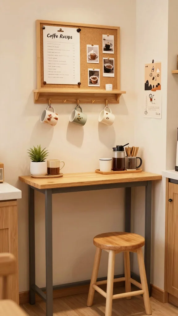 Turn a corner into a cozy coffee corner. Use a small console table or a narrow shelf to define the space without crowding the room. Add cute hooks for hanging mugs and small shelves for essentials. Include a comfy stool for that cafe feel. A small bulletin board holds recipes or quotes for a warm vibe. Personal touches like photos make the nook feel like your own escape. This nook is perfect for a quiet moment with your brew.