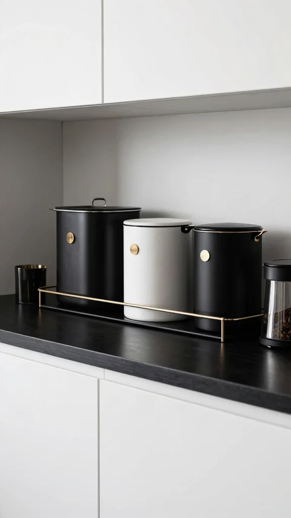 A chic black and white coffee bar feels timeless. A black countertop with white cabinets creates strong contrast. Use black and white containers to keep items cohesive. Add metallic accents like brass or chrome to lift the look. This look stays sleek while keeping things organized. It works well as a statement piece or a quiet corner of your kitchen.