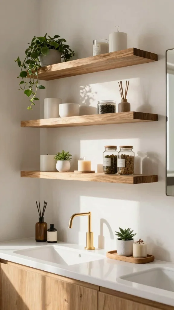 Installing elegant wall shelves can beautifully display decorative items while maximizing counter space. Select floating shelves in wood or metal that align with your decor. These shelves can hold plants, candles, or beautiful jars, adding dimension and personality to your bathroom.