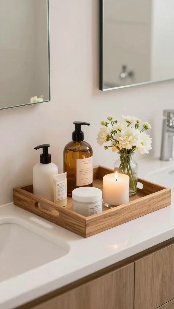 – A chic tray display can organize and elevate your bathroom essentials while adding a stylish touch.