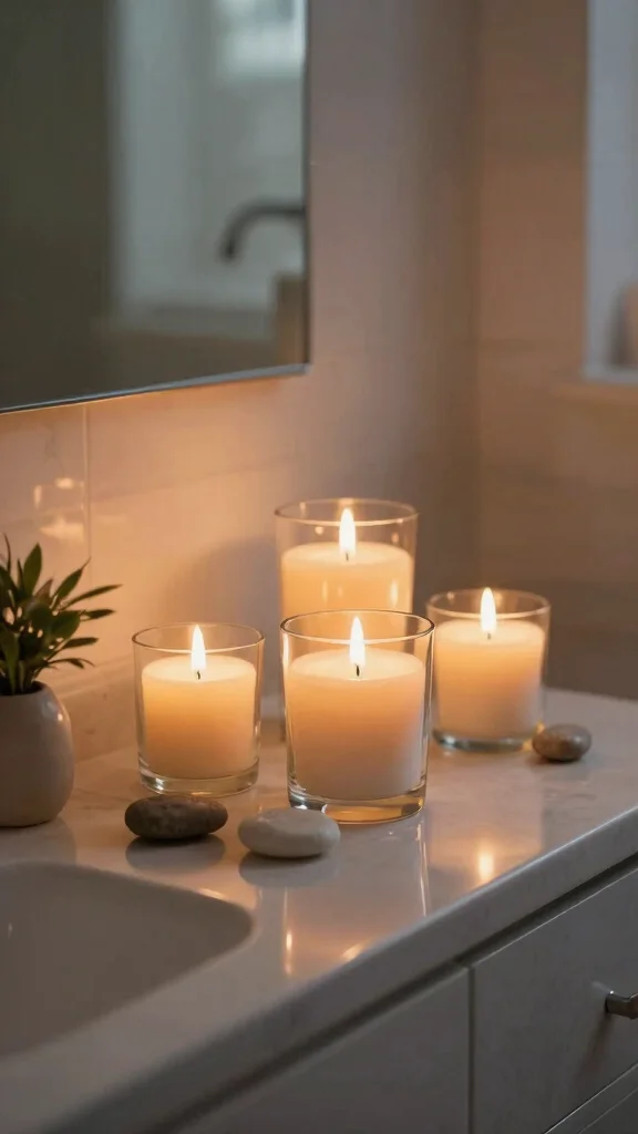 The soft glow of candlelight transforms your bathroom into a tranquil spa-like haven. Opt for enclosed holders for safety while enhancing the serene atmosphere.