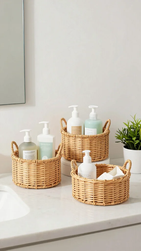 Maintain a pristine and organized bathroom counter with stylish storage options. Use decorative boxes or baskets to conceal toiletries or items you don’t use daily. Materials like rattan or wood add warmth and texture, enhancing the overall appeal of your space.