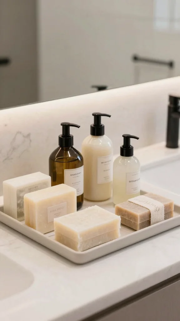 A chic tray display can instantly elevate your bathroom counter, offering both organization and style. This design element transforms clutter into a cohesive arrangement, making your essentials feel more intentional. Select a tray in materials such as sleek acrylic, classic matte black, or even a touch of mirrored glam to enhance visual interest. Arrange your daily items—like lotions, perfumes, and toothbrushes—on the tray for a streamlined appearance.