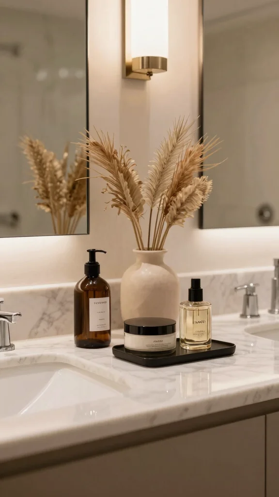 To enhance usage, consider these tips: Incorporating modern technology can elevate your bathroom’s luxury factor significantly. Consider adding a smart mirror with built-in lighting or a stylish Bluetooth speaker to enhance your relaxation experience. These tech gadgets blend functionality with style, enriching your daily routine. For seamless integration, keep these tips in mind: Modern technology not only adds convenience but also brings a contemporary feel to your bathroom, impressing guests and enhancing your experience. Complete your bathroom counter with a few luxurious finishing touches. Consider adding a decorative jewelry box for your rings, a stylish clock, or a chic basket for beauty essentials. These small details elevate the overall appeal and provide practical solutions for organization. To maintain balance, try these tips: These finishing touches create a polished and inviting environment, ensuring your bathroom always feels luxurious and welcoming. With these 18 bathroom counter decor ideas, you’re well on your way to transforming your space into a luxurious haven. Remember, the key is to balance style with functionality, ensuring that your bathroom is not only beautiful but also practical. As you experiment with these ideas, let your personality shine through, creating a space that feels uniquely yours! Start with a clean, clutter-free base and build from there. Use a chic tray to group essentials, add 1–2 statement pieces (like a glass vase or a sculptural soap dispenser), then layer in texture with a woven basket or linen hand towel. Choose a cohesive color palette (neutrals with a metal or black accent) and finish with soft lighting or a reflective mirror nearby to instantly elevate the space. A small plant or air-purifying greenery completes the luxe look while staying practical for daily use. These bathroom counter decor ideas are easy to implement even in a rental. Opt for finishes that catch the eye without looking fussy. Marble or stone-look trays and countertops add instant luxury, especially when paired with brushed brass or matte black hardware. Use clear glass or ceramic containers, a stone or wood matte tray, and a single metallic accent to avoid clutter. Keep surfaces easy to wipe and avoid overcrowding; this is essential for home decor that lasts. For longevity, choose moisture-resistant materials and place decor away from direct water splashes. For entertaining at home, make your bathroom counter a planning-friendly feature rather than a catch-all. Pick a theme (coastal, glam, minimalist) and carry it through with a coordinating tray, napkins or hand towels, and a scented candle or diffuser. Create a mini ‘refreshment station’ vibe with a small glass bottle of hand soap, a pretty dispenser, and a neatly folded stack of guest towels—easy to grab and wipe hands. Keep safety in mind: avoid fragile items near water and ensure cords and candles are away from shower zones. With thoughtful touches, your party planning vibes will shine through your bathroom counter decor ideas. In small or rental bathrooms, go vertical and keep only 3–5 well-chosen pieces. Use a slim tray to group items, add a tiny potted plant, and consider wall hooks for towels or jewelry storage instead of cluttering the counter. Choose compact, high-impact pieces like a sculptural soap pump, a glass jar with cotton rounds, and a single vase with a fresh stem. If you want texture, try a removable marble- or terrazzo-look contact paper on the tray or a small reveal that’s easy to undo when you move. These home decor moves keep the luxe vibe without committing or damaging surfaces. Treat your bathroom counter decor as a revolving vignette. Do a quick refresh seasonally or whenever you feel the space looks tired. Swap in new accents (a different vase, color-handled soaps, fresh greenery) while keeping a couple of timeless pieces. Regular cleaning and decluttering help maintain the luxe vibe; wipe surfaces weekly and rotate one or two items every few months to keep the look fresh within your home decor style.