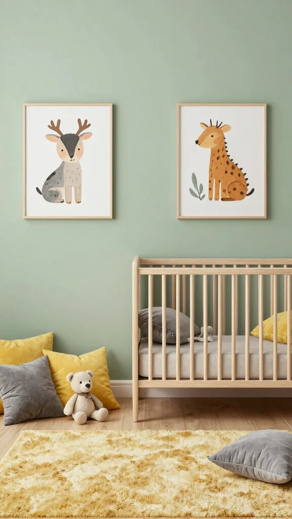 Fun fact: 85% of early creativity blooms near a dedicated art corner. In a sage green nursery ideas setup, bold murals and playful decals invite imagination. Keep a cozy art station handy to support expression and joyful, creative development.