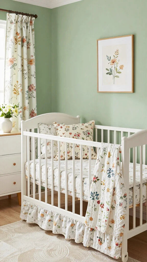 Do you love the beauty of flowers? Embrace florals with a sage green nursery that feels fresh and vibrant. Incorporate floral patterns through bedding, curtains, and wall decor to create a cheerful atmosphere. Mixing different floral prints while keeping sage green as a unifying color will enhance the design. Adding real or faux flowers can bring nature indoors, promoting a nurturing environment for your baby.