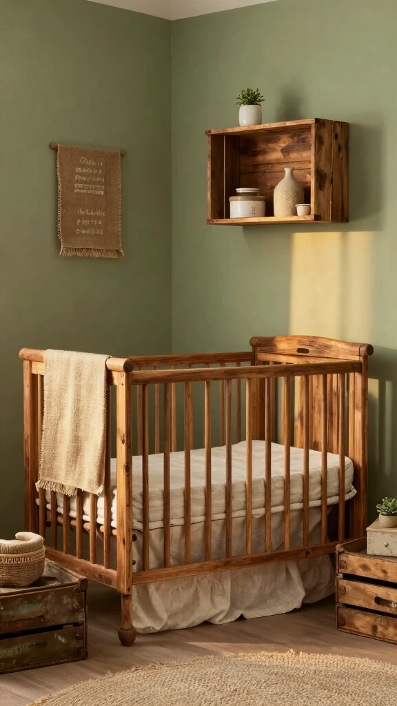 Do you yearn for the charm of the countryside? Bring a rustic farmhouse theme to your nursery with sage green hues. Utilize reclaimed wood for furniture and decor, crafting a warm and welcoming atmosphere. Pair sage green with cream, beige, and soft browns for a harmonious palette. Decorate with vintage crates, burlap accents, and soft linens that enhance the rustic feel. This design creates a cozy vibe, making it a nurturing space for your little one.