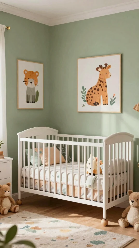 Looking to spark joy and imagination? Infuse your sage green nursery with whimsical creatures that inspire playfulness. Choose bedding, wall art, and decor featuring friendly animals and playful characters that create a joyful atmosphere. Soft plushies and toys enhance the theme, making the space fun and inviting for your baby. This design fosters a love for storytelling and creativity, encouraging a vibrant environment.
