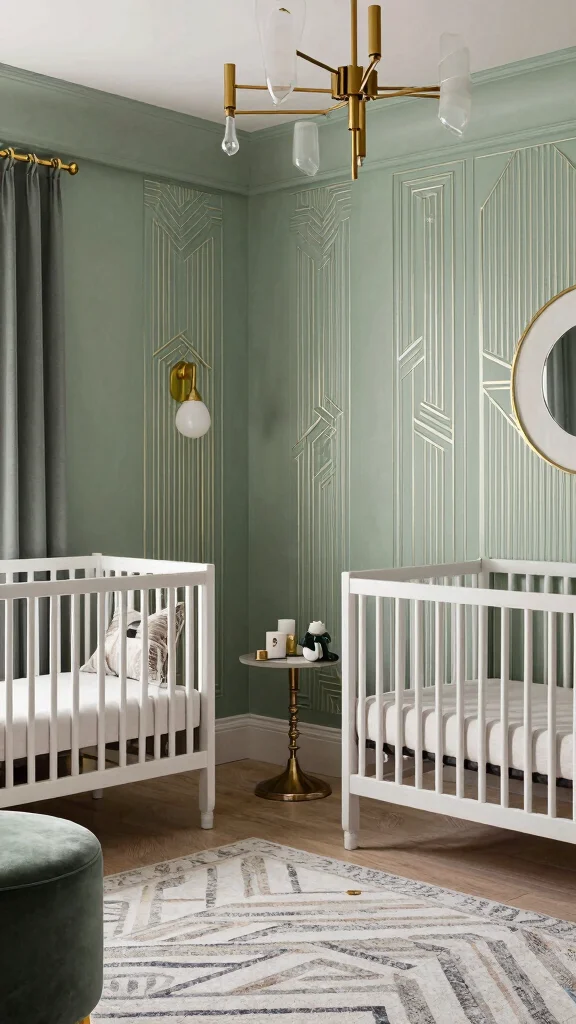 Ready to embrace sophistication? Combine the elegance of Art Deco with sage green for a nursery that feels timeless. Choose geometric patterns, luxurious materials, and rich colors that complement sage green beautifully. Decorate with gold or brass accents, adding glamour without overpowering the serene backdrop. This design creates a chic and elegant environment that can grow with your child while providing a calm sanctuary.
